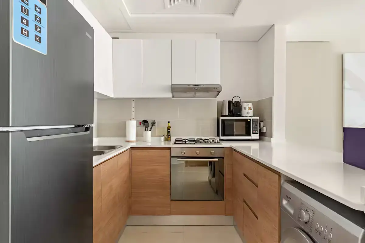 Modern kitchen equipped with essential appliances, including a stove, oven, full-sized fridge, toaster, kettle, microwave, and espresso machine.