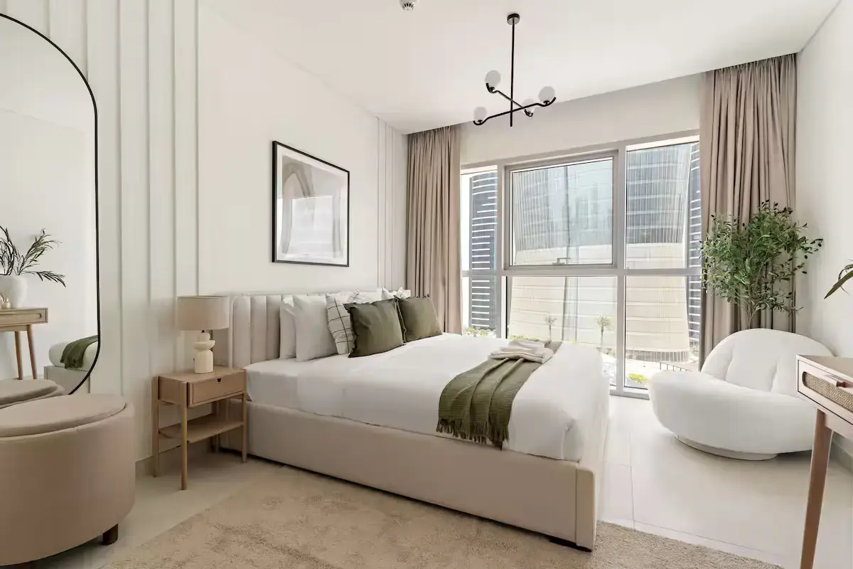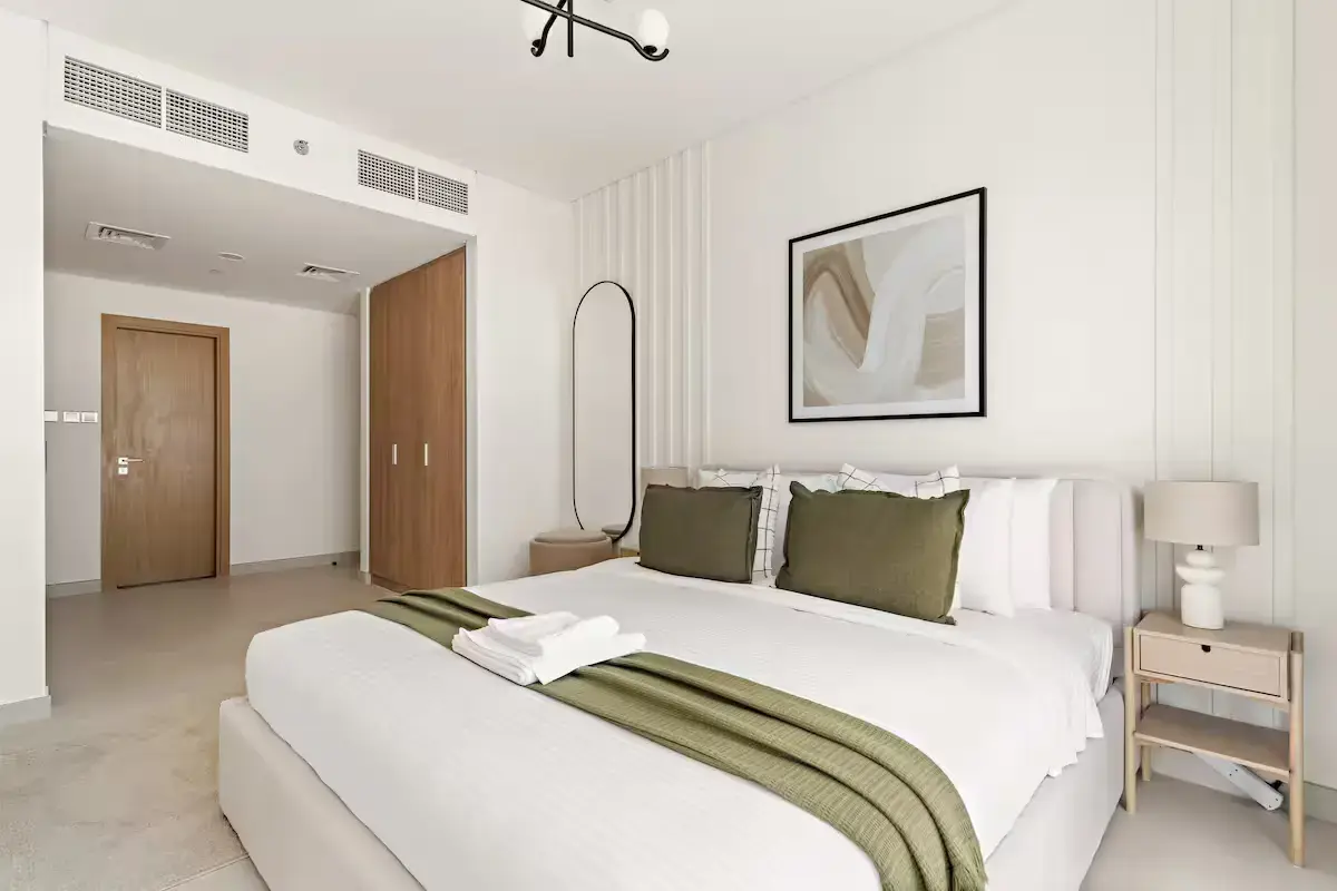 Spacious bedroom, with a king-sized bed, built-in wardrobes, and dedicated workspace with desk and chair.